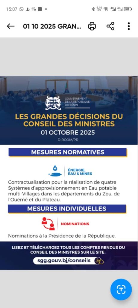 Au titre des mesures normatives, le gouvernement a approuvé la contractualisation pour la réalisation de quatre systèmes d’approvisionnement en eau potable multi-villages. Ces infrastructures seront implantées dans les départements du Zou, de l’Ouémé et du Plateau, zones où la demande en eau potable demeure particulièrement pressante.