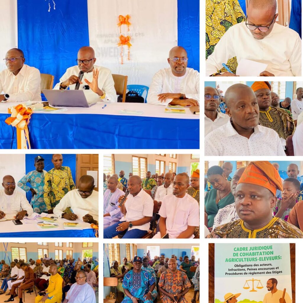 Présenté officiellement au public ce samedi 21 mars 2026 au Centre de promotion sociale d’Aplahoué, l’ouvrage a suscité un vif intérêt. À l’initiative de son auteur, la cérémonie de dédicace a réuni un public diversifié composé d’acteurs du monde rural, de juristes, de responsables administratifs et de citoyens préoccupés par la montée des tensions entre agriculteurs sédentaires et éleveurs transhumants. Les échanges ont permis de mettre en lumière les enjeux d’une cohabitation souvent fragilisée par des incompréhensions et des violations des règles établies.
