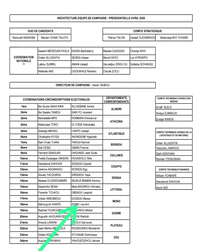 Au sommet de l’édifice trône un comité stratégique composé de figures politiques majeures et de personnalités d’expérience. Autour du duo de candidats, Romuald Wadagni et Mariam Chabi Talata, gravitent plusieurs poids lourds de la majorité présidentielle.