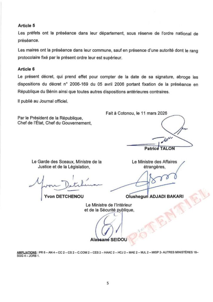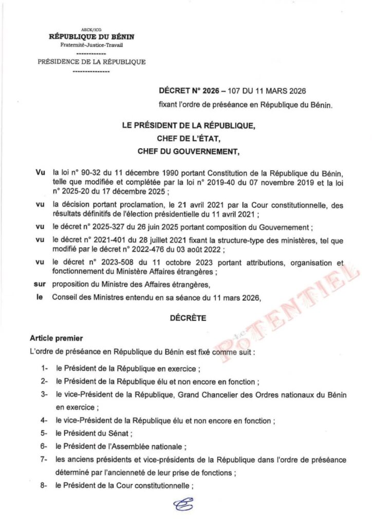 Au Bénin, l’organisation protocolaire de l’État connaît une nouvelle structuration officielle. Par le décret n°2026-107 du 11 mars 2026, le président de la République, Patrice Talon, fixe l’ordre de préséance des personnalités publiques, établissant une hiérarchie précise de 68 fonctions, allant du sommet de l’État aux autorités locales de base.
