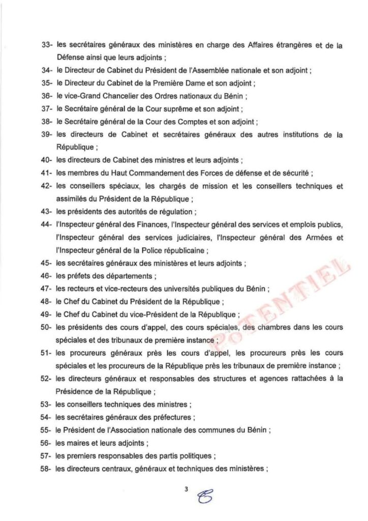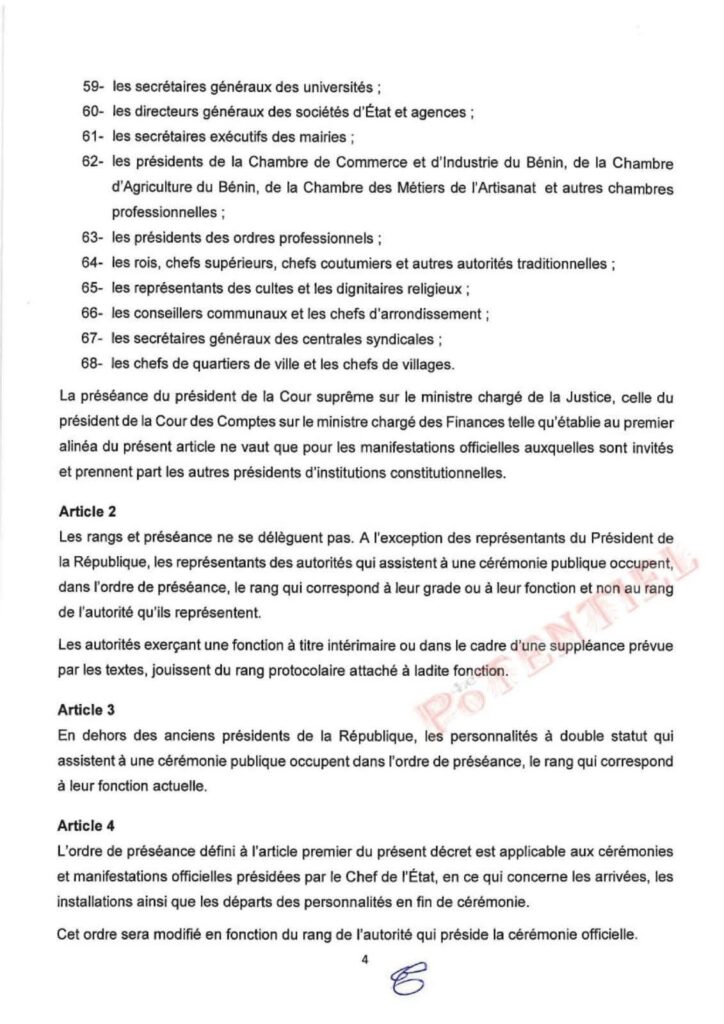 Les autorités traditionnelles et religieuses, telles que les rois, chefs coutumiers et dignitaires des cultes, sont également prises en compte, tout comme les représentants syndicaux et les chefs de quartiers et de villages, qui occupent les derniers rangs de cette classification.