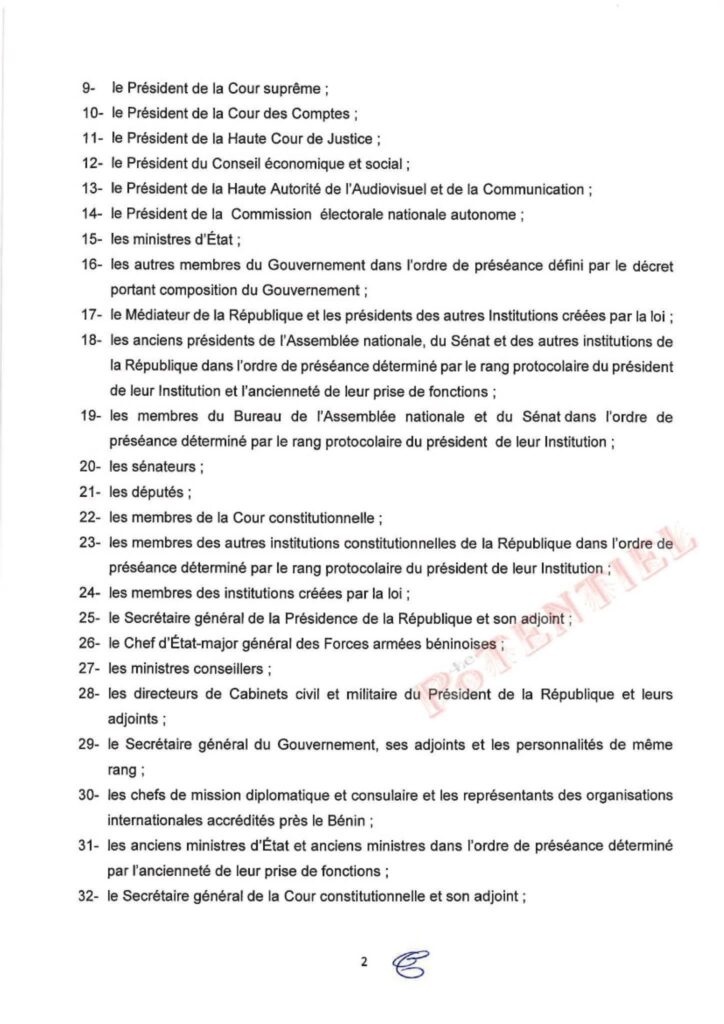 Le texte précise également la place des anciens chefs d’État et anciens vice-présidents, classés selon l’ancienneté de leur prise de fonction. Les membres du gouvernement, les responsables des institutions constitutionnelles, les parlementaires ainsi que les hauts cadres de l’administration publique y figurent également selon un ordre bien défini.