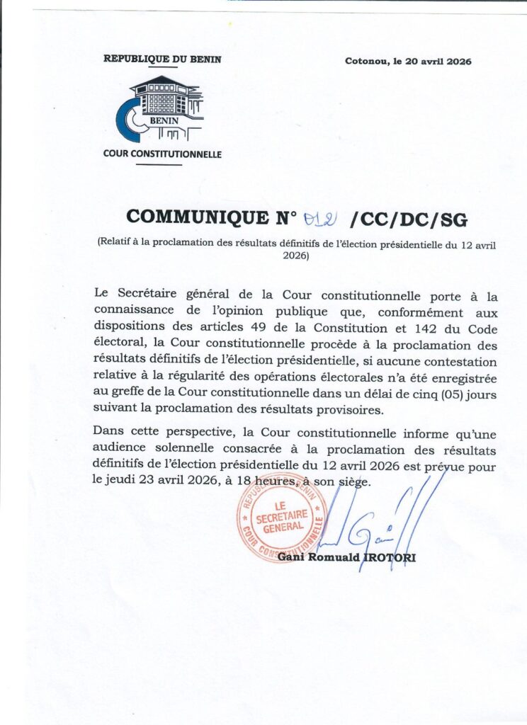 Dans un communiqué officiel rendu public ce mardi 20 avril 2026, le secrétaire général de la haute juridiction, Gani Romuald Irotori a informé l’opinion nationale et internationale de cette échéance cruciale, marquant l’aboutissement du processus électoral engagé dans le pays.