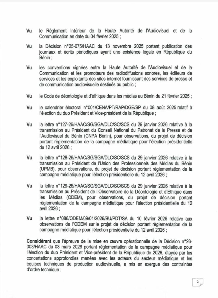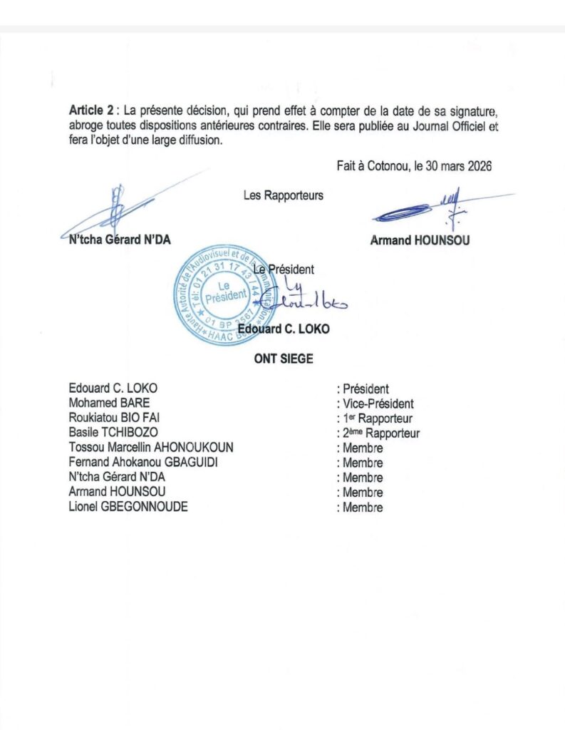 Entrée en vigueur dès sa signature le 30 mars 2026, la Décision N°26-011 abroge toutes les dispositions antérieures contraires. Elle sera publiée au Journal officiel et fera l’objet d’une large diffusion auprès des acteurs du paysage médiatique.