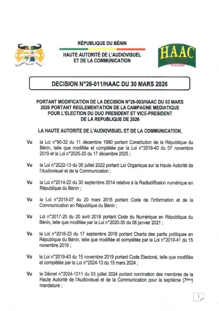 À quelques jours de l’élection présidentielle prévue le 12 avril 2026, la Haute Autorité de l’Audiovisuel et de la Communication (HAAC) procède à un ajustement stratégique du cadre réglementaire de la campagne médiatique. Par la Décision N°26-011 du 30 mars 2026, signée par son président Edouard C. Loko, l’institution de régulation des médias vient modifier certaines dispositions de la Décision N°26-003 du 03 mars 2026, afin de corriger des contraintes techniques relevées sur le terrain et de renforcer l’équité entre les candidats.
