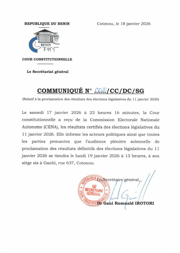 Selon le communiqué signé du Secrétaire général de la Cour constitutionnelle, Gani Romuald Irotori, les résultats certifiés des élections législatives ont été officiellement reçus le samedi 17 janvier 2026 à 23 heures 16 minutes. Cette transmission marque l’aboutissement de la phase administrative du scrutin et ouvre la voie à la validation constitutionnelle des résultats.